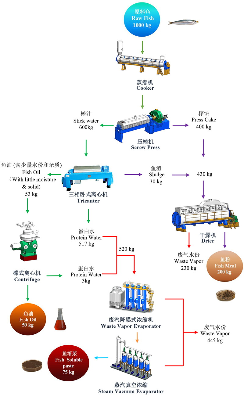 我們可以根據客戶的投資規模,工廠選址,環保要求等條件,為其選擇更好的工藝方案。現以第4種生產線配套方案為例作簡要介紹,同時結合相應的工藝流程圖及物料平衡圖,供客戶參考。物料平衡圖中的數據,尤其是魚油的得率,會因原料魚種類及其捕獲季節的不同而有所變化。